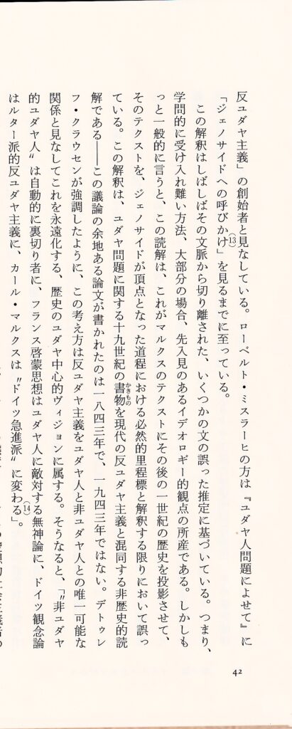 ベンヤミンやトロツキイへの言及に、それほど触発されるところはないにしても、20世紀のマルクス思想の展開という歴史的文脈に置かれることによって、新らたな発見に導かれた。